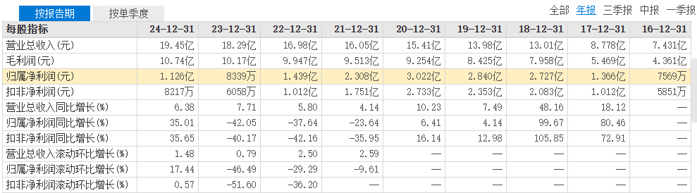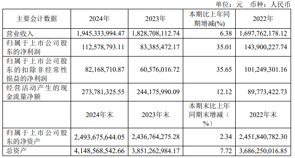2024年,公司实现营业收入19.45亿元,同比增长6.38%;归属于上市公司股东的净利润1.13亿元,同比增长35.01%;归属于上市公司股东的扣非净利润8216.87万元,同比增长35.65%;经营活动产生的现金流量净额为2.74亿元。