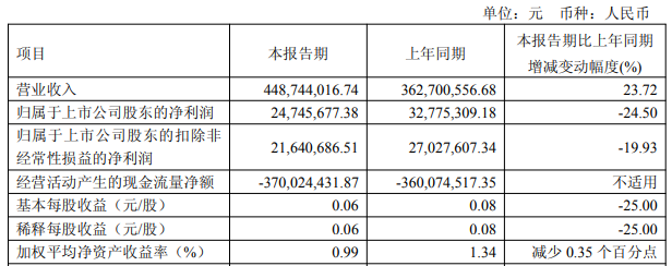 2025年一季度,公司营业收入为4.49亿元,同比增长23.72%;归属于上市公司股东的净利润为2474.57万元,同比下滑24.50%;归属于上市公司股东的扣非归母净利润为2164.07万元,同比下滑19.93%;经营现金流净额为-3.70亿元。