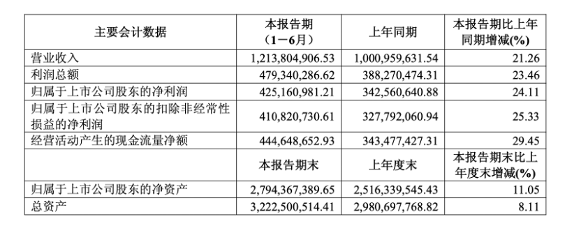 今年上半年,惠泰医疗实现营业收入12.14亿元,同比增长21.26%;归属于上市公司股东的净利润4.25亿元,同比增长24.11%;归属于上市公司股东的扣除非经常性损益的净利润4.11亿元,同比增长25.33%。
