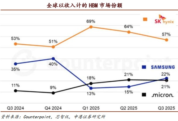 Counterpoint的数据显示,截至2025年9月末,全球以收入计的HBM市场份额中,SK海力士占据了57%的市场份额,三星占据22%的市场份额,美光占据21%的市场份额。