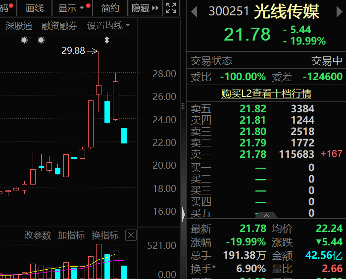 影视院线板块大幅走低,光线传媒“20cm”跌停,博纳影业、横店影视、上海电影等均跌停。