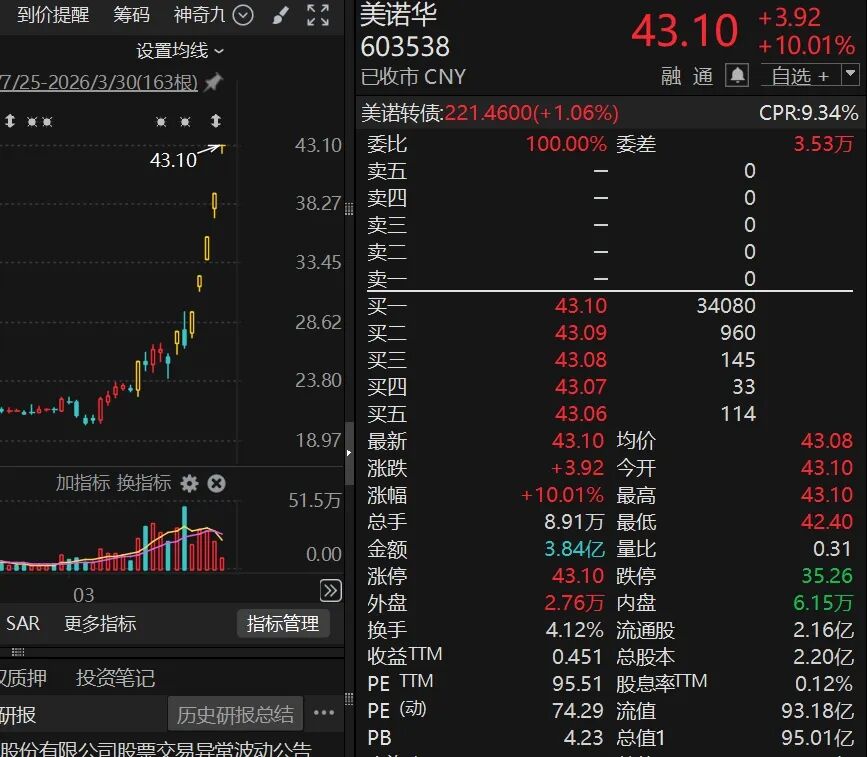 3月30日,美诺华再度涨停收盘,上演5连板。也是公司最近7个交易日内,第6次涨停收盘。