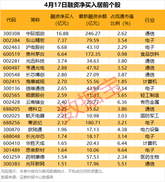 具体到个股,4月17日共有1784只股获融资净买入,净买入金额在1亿元以上的有43只,其中4只融资净买入额超5亿元。中际旭创融资净买入额居首,当日净买入16.88亿元;其次是东山精密、沪电股份,融资净买入金额分别为7.37亿元、6.68亿元。