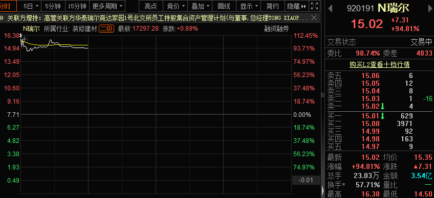 N瑞尔(920191)今日在北交所上市,开盘价15.99元,上涨107.39%。公司是一家专业为高炉炼铁系统提供长寿技术方案及关键耐火材料的高新技术企业,主要从事炼铁高炉高效、长寿、节能、绿色、环保等技术与所需耐火材料的研发、生产和销售。