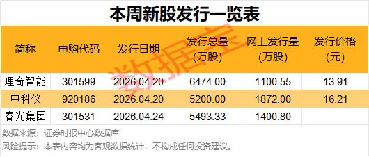 根据发行安排,本周暂有3只新股申购,本周一(4月20日)可申购理奇智能、中科仪,本周五可申购春光集团。