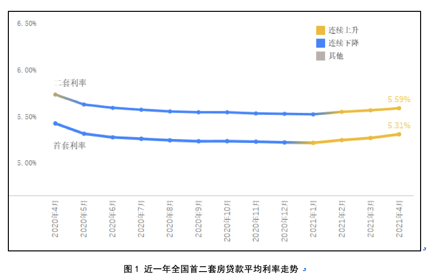 融360大数据研究院的数据也显示,2021年4月(数据采集期为2021年3月20日~2021年4月18日),全国首套房贷款平均利率为5.31%,环比上涨4BP;二套房贷款平均利率为5.59%,环比上涨2BP。其中,21个二线城市的房贷利率环比上涨,9个城市的首套房房贷利率环比涨幅超过10BP,中山、惠州和东莞的首套涨幅位居前三;大连和哈尔滨的房贷利率本期涨幅也较大。