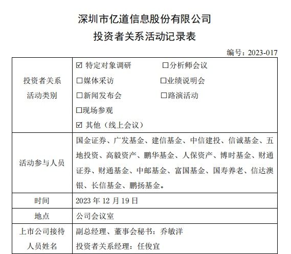 此外,12月19日,亿道信息接受了来自国金证券、广发基金、中信建投等多家机构的调研。