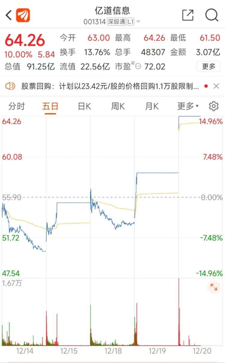 12月20日,MR概念股继续活跃,亿道信息再度涨停,4个交易日内录得3个涨停。截至午间收盘,亿道信息报64.26元/股,总市值91.25亿元。