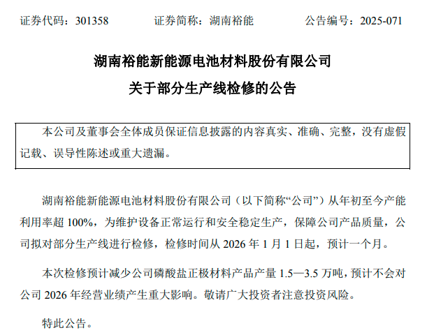 湖南裕能称其从年初至今产能利用率超100%,为维护设备正常运行和安全稳定生产,保障产品质量,拟对部分生产线进行检修,检修时间从2026年1月1日起,预计一个月,本次检修预计减少公司磷酸盐正极材料产品产量1.5—3.5万吨。