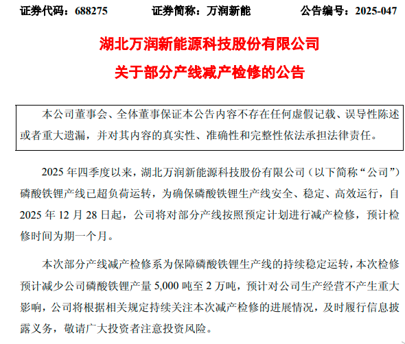 万润新能称,2025年四季度以来其磷酸铁锂产线已超负荷运转,为确保磷酸铁锂生产线安全、稳定、高效运行,自2025年12月28日起,将对部分产线按照预定计划进行减产检修,预计检修时间为期一个月,本次检修预计减少公司磷酸铁锂产量5000吨至2万吨。