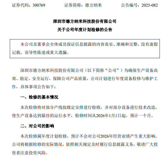 12月26日早间,德方纳米公告,为确保生产设备高效、稳定、安全运行,保障公司产品质量,计划进行年度设备检修与维护工作,检修时间从2026年1月1日起,预计一个月,本次检修属年度计划检修。