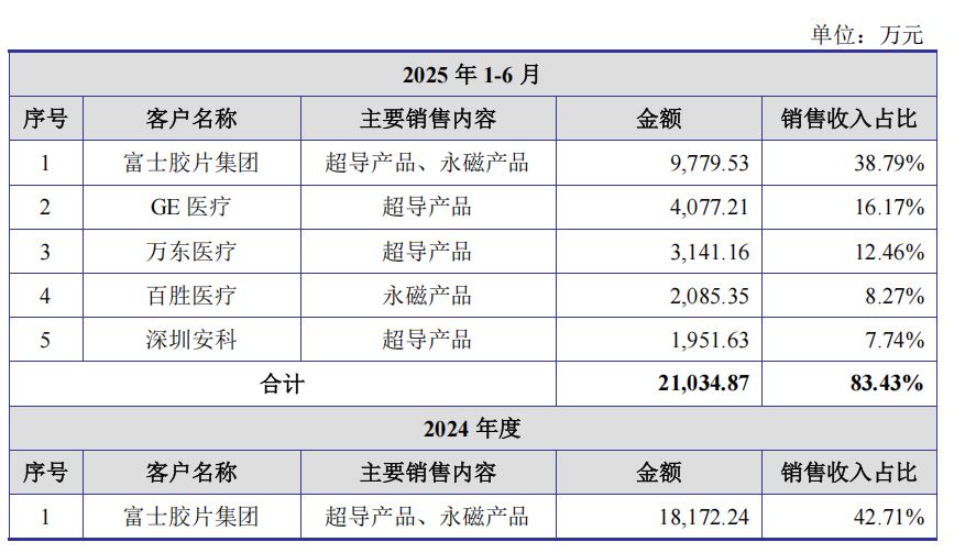 健信超导的客户集中度高到令人窒息——前五大客户贡献近80%营收,第一大客户富士胶片集团占比超40%。