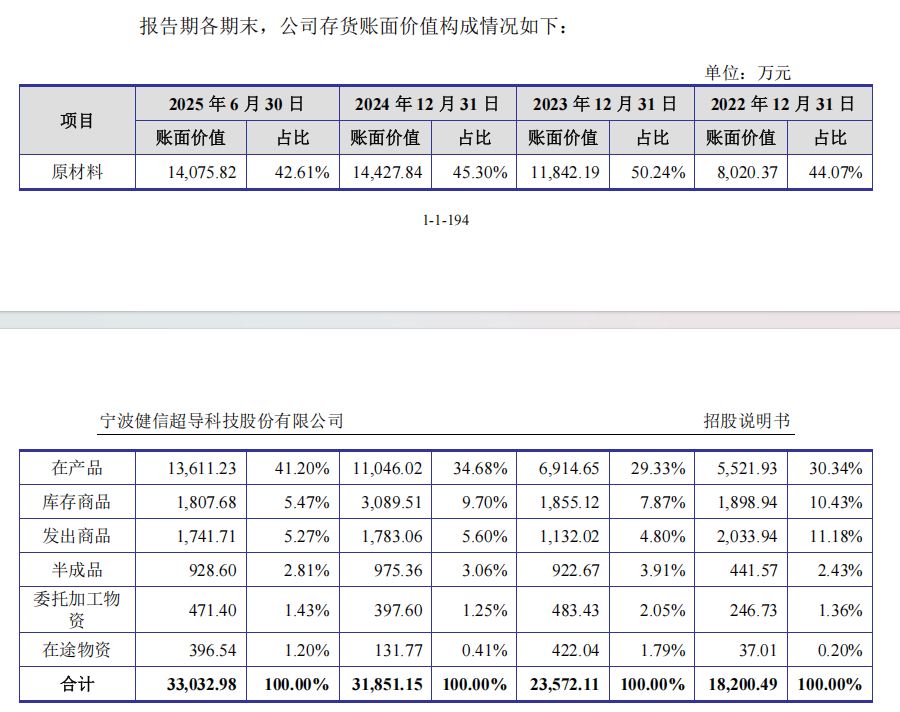健信超导的存货堆积如山。2022-2024年,存货账面价值从1.82亿飙升至3.19亿,占流动资产比例高达62.56%,远超货币资金。