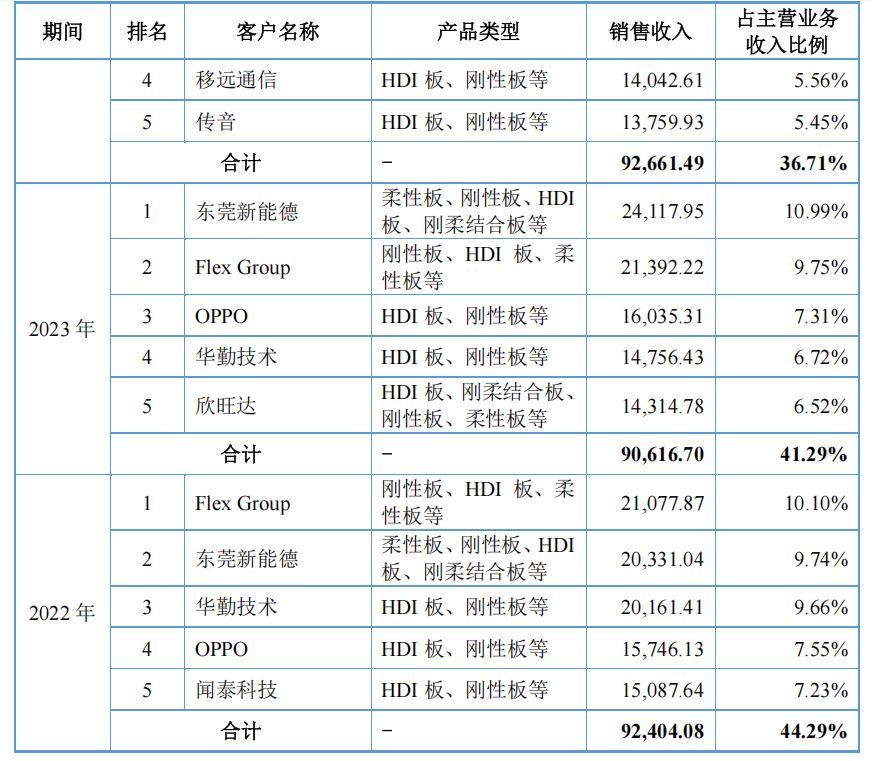 红板科技下游应用领域集中于消费电子和汽车电子,主要客户包括东莞新能德、OPPO、伟创力等。报告期内,公司向前五大客户的销售收入占比分别为44.29%、41.29%、36.71%和31.63%,客户集中度较高。尽管公司称与主要客户合作稳定,但若大客户生产经营波动或采购量减少,将对公司订单造成显著影响。