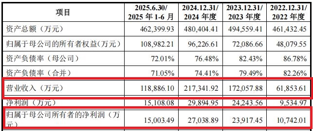 理奇智能的报告期财务数据初看颇具吸引力。从2022年至2024年,公司营业收入从6.19亿元飙升至21.73亿元,复合增长率高达87.45%。同期净利润也从1.07亿元增长至2.70亿元。