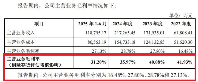 理奇智能的盈利能力正遭受行业竞争挤压。报告期内,公司主营业务毛利率剔除存货评估增值影响后,从2022年的41.93%持续下滑至2025年上半年的31.20%。
