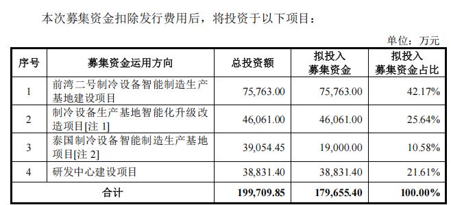 此次IPO募投项目中,包括“前湾二号制冷设备智能制造生产基地建设项目”、“泰国制冷设备智能制造生产基地项目”等,计划大幅增加产能。